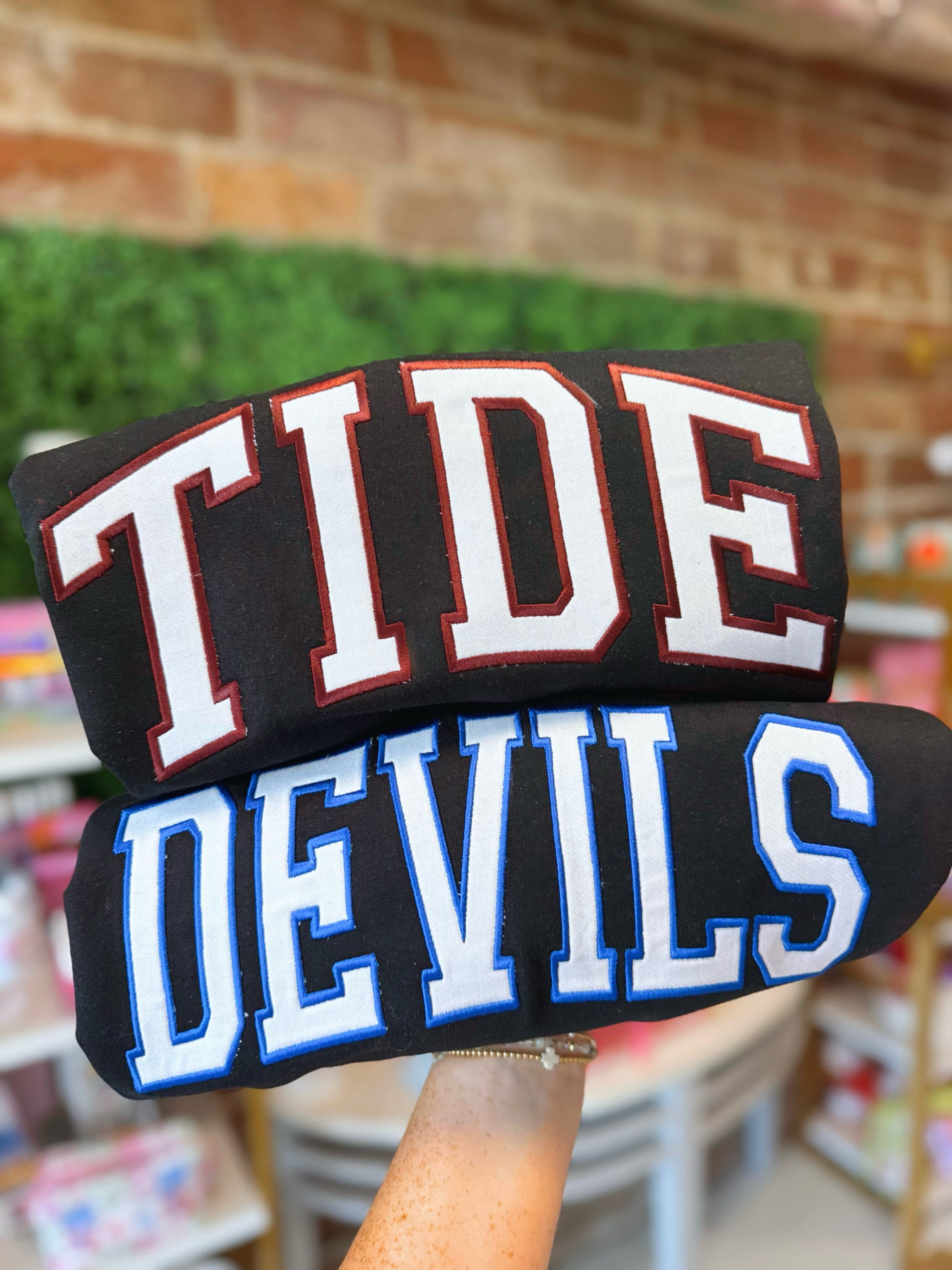 Black sweatshirt with white fabric. Thread color will be your choice!