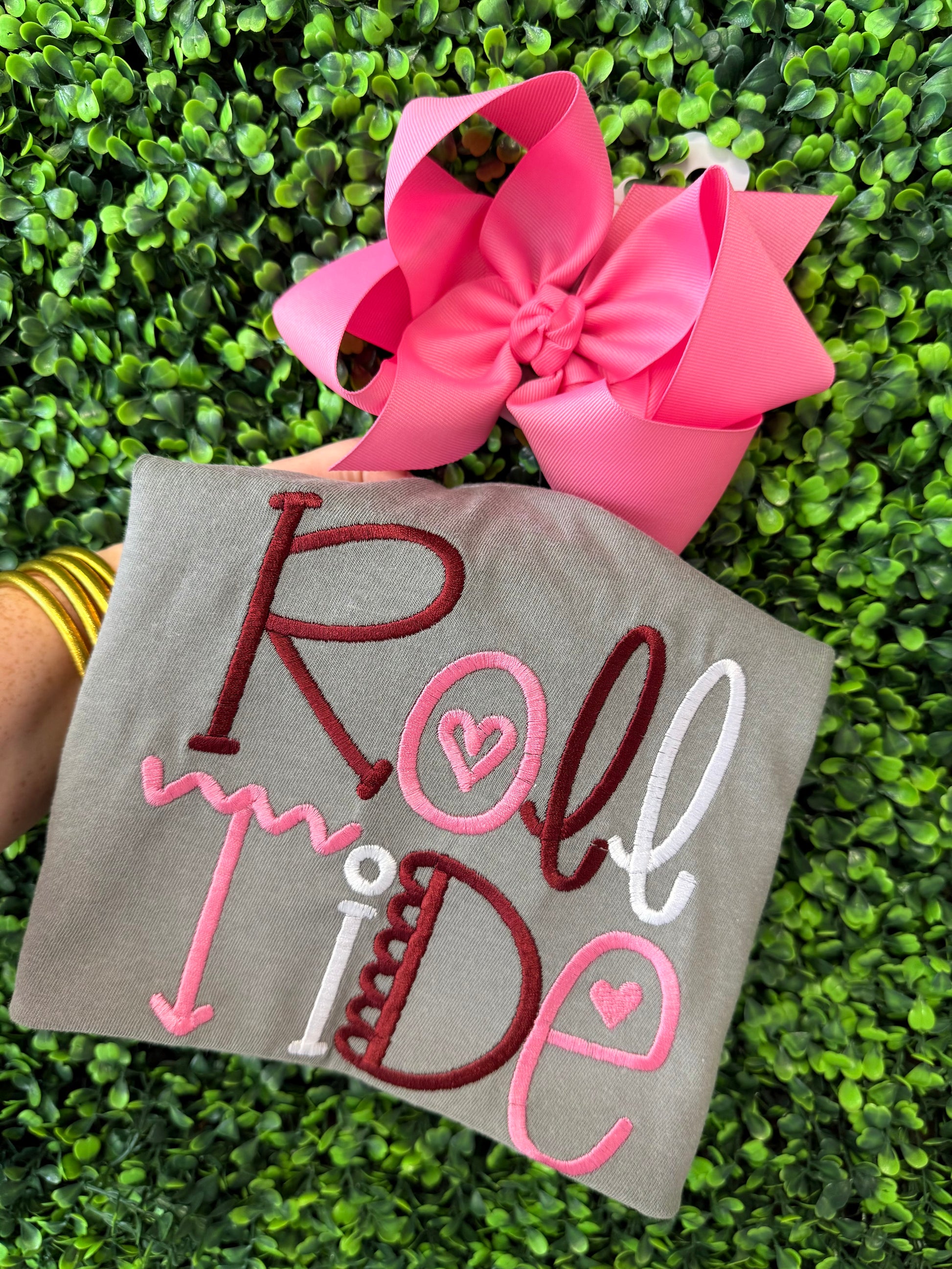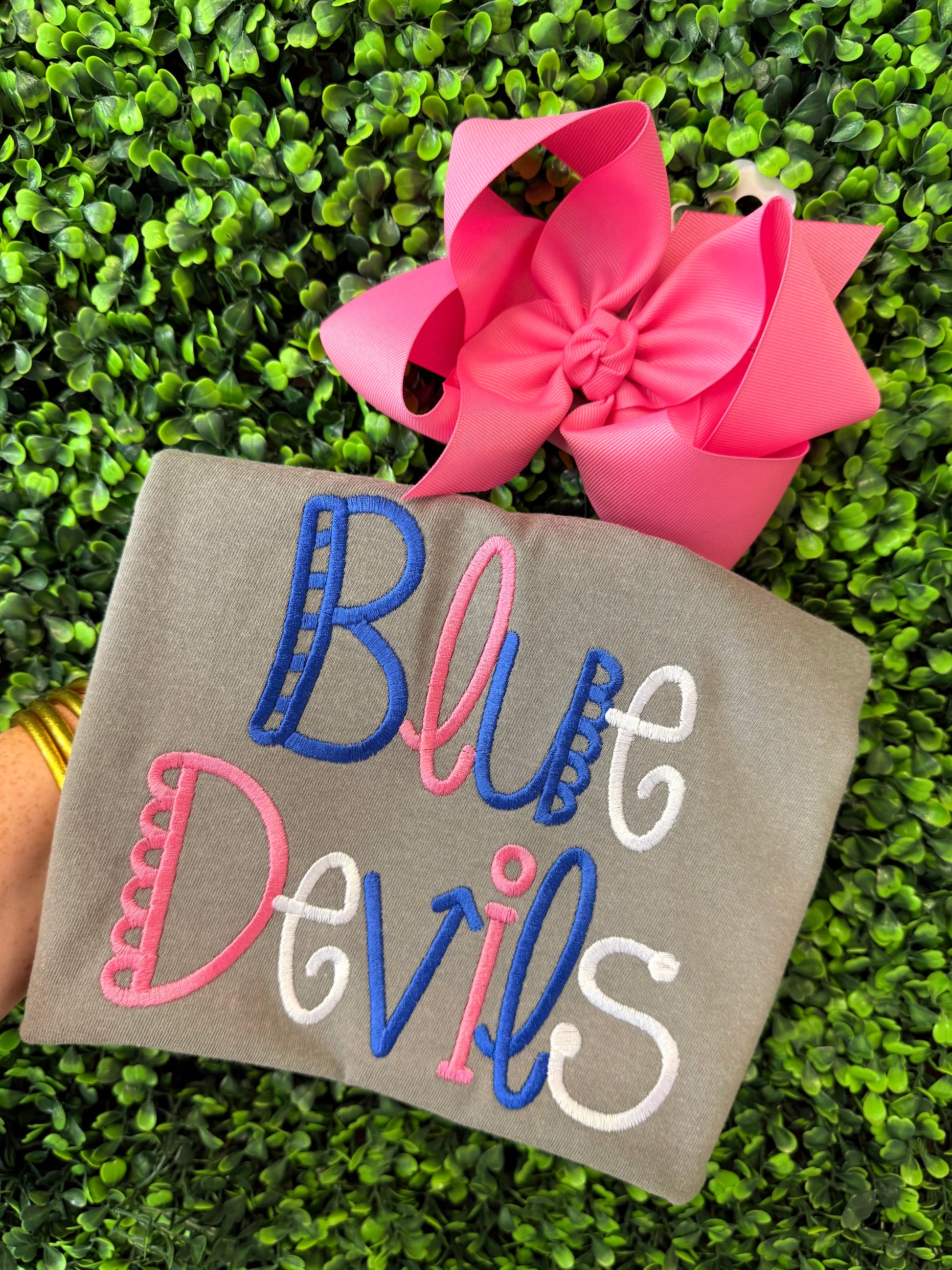 Gray Comfort Color t-shirt with your school name stitched in the cutest doodle font with bubblegum pink, white, and a thread color of your choosing!