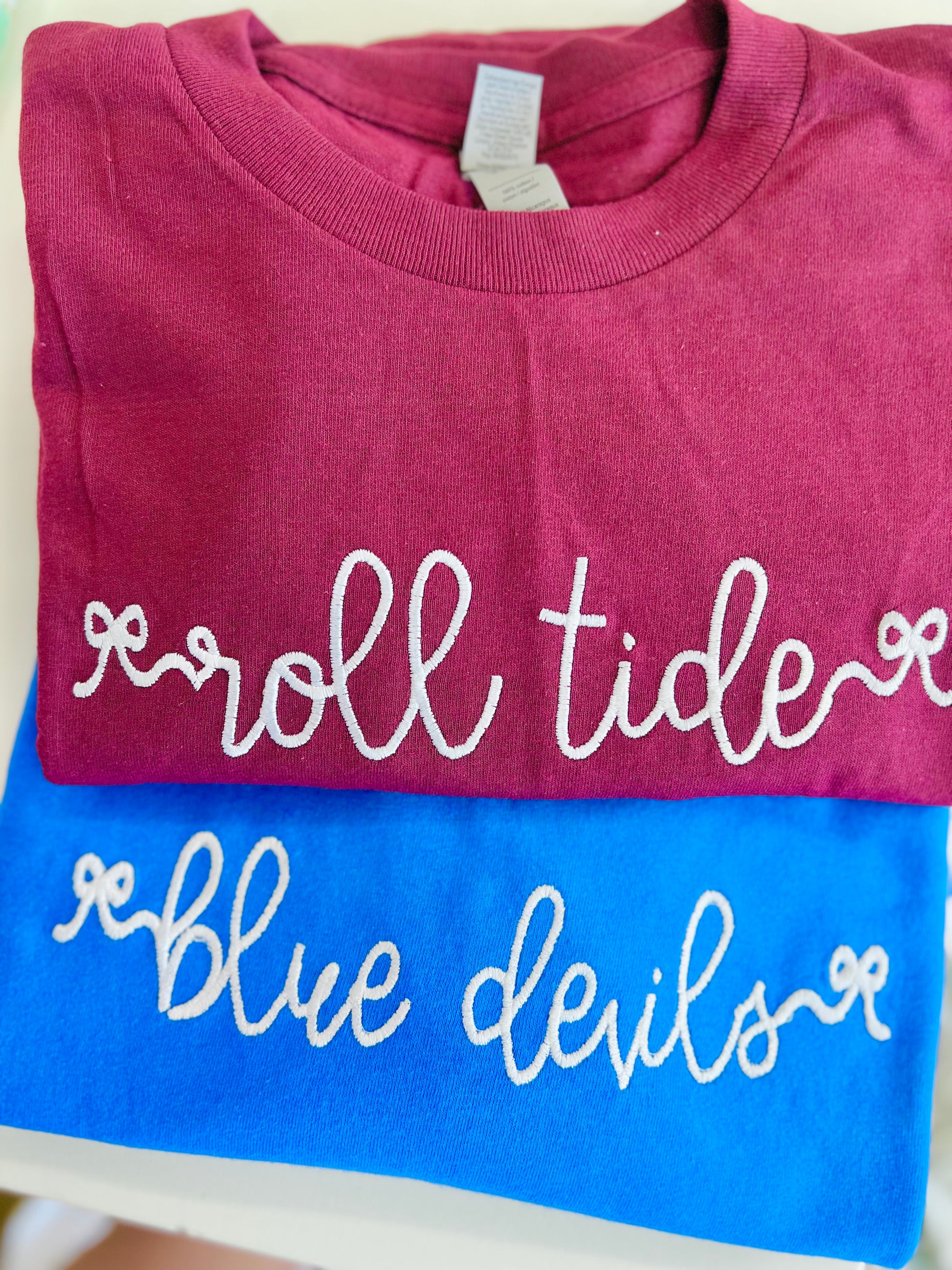 Your school name/phrase with bows stitched in white thread on your choice of Gildan T-shirt color.